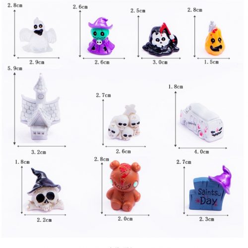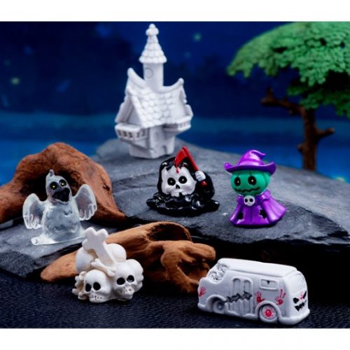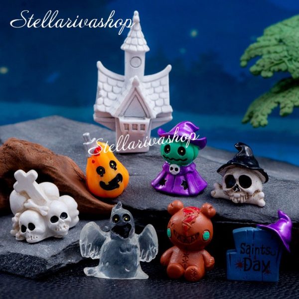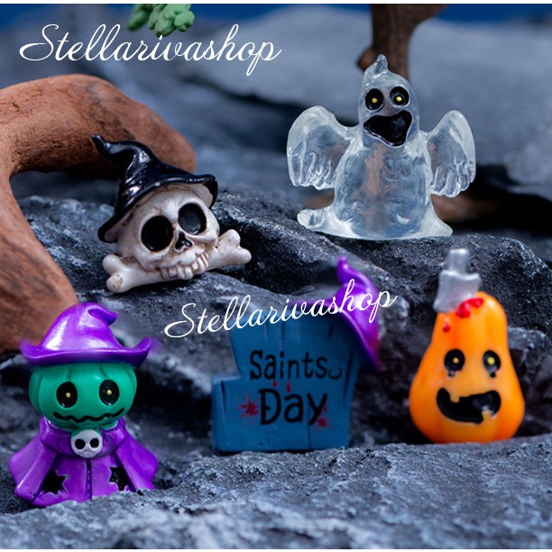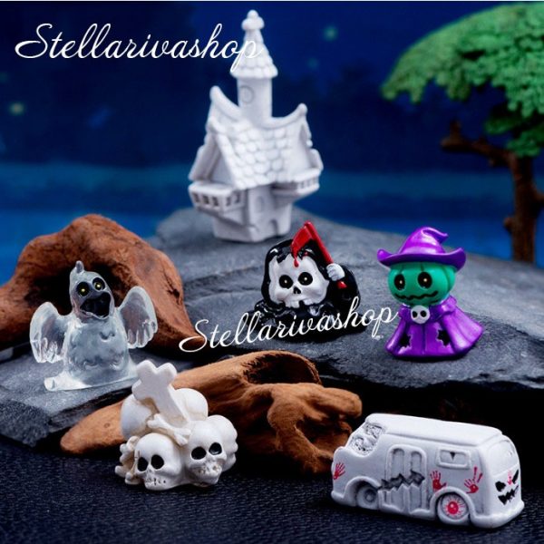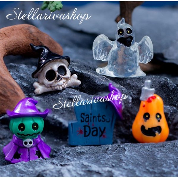 Tượng bí ngô Hallowen, nhà phù thủy, xe monster car trang trí bàn học, decor terrarium